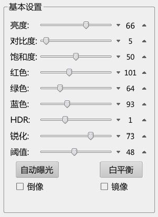 相机基本参数部分包含相机的亮度 对比度 饱和度 颜色等参数调节,控制菜单最下端可以控制图像镜像倒像翻转。一些常规的图像效果部分的参数设置在此界面完成,需要详细说明的是锐化参数调节越大图像越清晰,但同时会产生噪点,此时需要调节阈值,阈值越大,降噪效果越明显,常规情况下阈值的建议值为10-30之间,不建议过大。