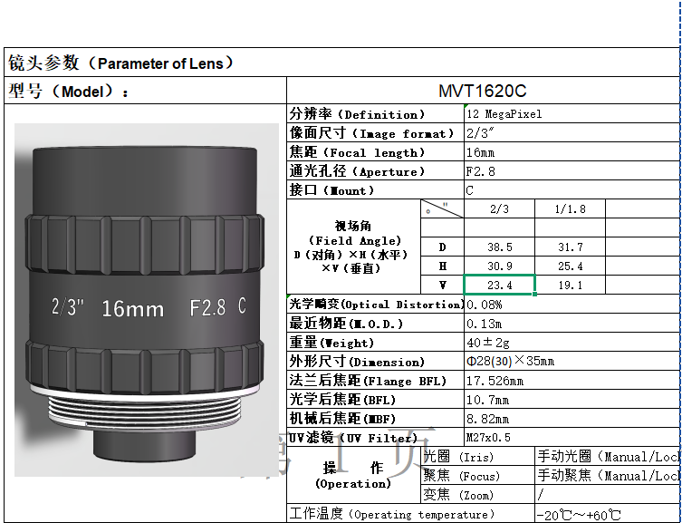 16mm1200万像素工业镜头